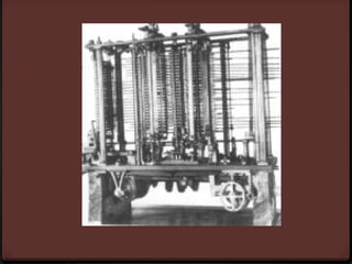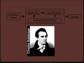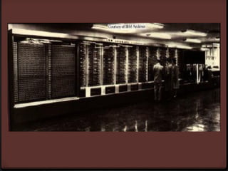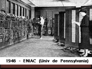 El documento proporciona un resumen cronológico de los hitos y personajes clave en la historia de la computación, desde los primeros métodos de conteo en la prehistoria hasta el desarrollo de las computadoras modernas. Se destacan inventos tempranos como el ábaco y la máquina de Pascal, así como las contribuciones de figuras como Babbage, Turing y los hermanos Von Neumann. También se describen algunas de las primeras computadoras electrónicas como la ENIAC y UNIVAC antes de resumir brevemente el desar