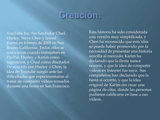 YouTube fue fundada en 2005 por Chad Hurley, Steve Chen y Jawed Karim. Aunque existe desacuerdo sobre el origen exacto de la idea, generalmente se acepta que surgió de la necesidad de compartir videos tomados en una fiesta. YouTube creció rápidamente y en 2006 fue adquirida por Google por $1.650 millones. Se ha convertido en la plataforma líder de video online donde los usuarios pueden subir y compartir videos fácilmente.