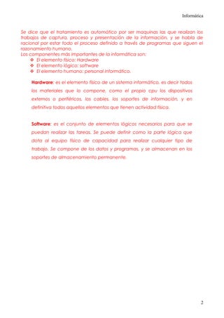 La informática estudia el tratamiento automático y racional de la información utilizando máquinas. Nace de la idea de ayudar al hombre en tareas repetitivas de cálculo y gestión. Se compone del hardware (elementos físicos), el software (elementos lógicos como programas y datos) y el personal informático.