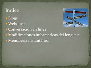 El documento resume brevemente diferentes temas relacionados con la comunicación en línea como blogs, webquest, conversaciones en línea, modificaciones del lenguaje e instantáneas. Explica que los blogs son espacios donde usuarios publican artículos de forma periódica, webquest son recursos didácticos con tareas en internet, conversaciones en línea permiten comunicación escrita en tiempo real de forma pública o privada, modificaciones del lenguaje cambian vocales y consonantes, y mensajería instantánea permite comunicación directa entre conocidos.