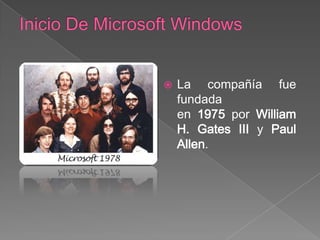La compañía Microsoft fue fundada en 1975 y lanzó su primer sistema operativo Windows en 1985. Microsoft luego lanzó varias versiones actualizadas de Windows, incluidas Windows 95 en 1995, Windows XP en 2001, y Windows 7 en 2009, cada una con nuevas características y mejoras. Windows ahora se integra con servicios en línea y la nube para brindar una experiencia más conectada a los usuarios.
