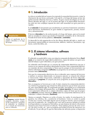 El documento describe los componentes básicos de un sistema informático. Explica que un sistema informático está compuesto de hardware (componentes físicos como el procesador, la memoria y las unidades de entrada/salida) y software (programas y aplicaciones). También distingue entre software básico (sistema operativo) y software de aplicaciones, y describe las funciones del procesador y otros componentes clave.