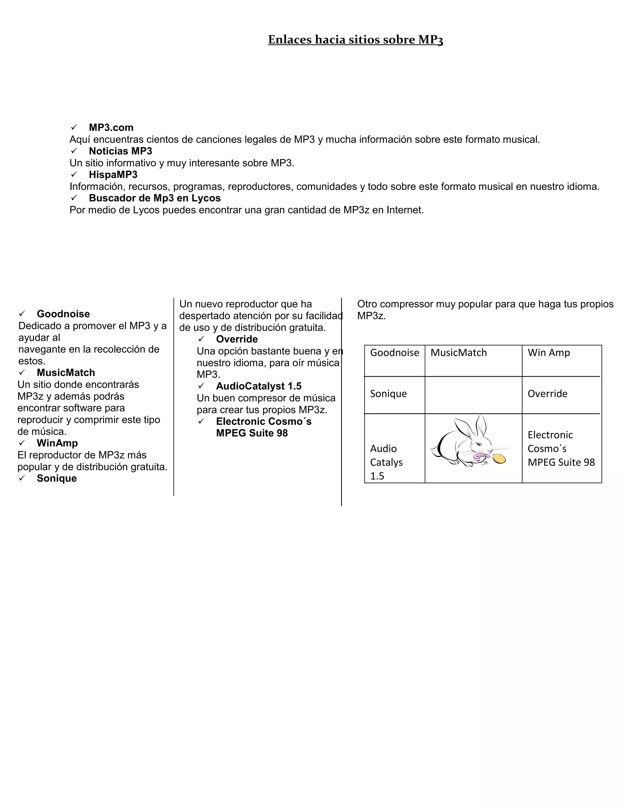 Este documento lista recursos en línea relacionados con el formato MP3, incluyendo sitios que ofrecen canciones MP3 legales, noticias e información sobre MP3, comunidades hispanohablantes sobre MP3, un buscador de MP3 en Lycos, sitios que promueven el formato MP3 y ayudan a encontrar archivos, sitios con software para reproducir y comprimir MP3, los reproductores de MP3 más populares WinAmp y Sonique, y programas para comprimir música en formato MP3 como AudioCatalyst 1.5 y Electronic Cosmo's