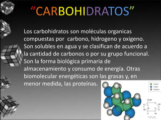 Este documento describe los carbohidratos, incluyendo su composición química, clasificación, fuentes, y función como fuente principal de energía. Los carbohidratos se clasifican como monosacáridos, disacáridos, o polisacáridos dependiendo de su complejidad molecular. Proveen energía al cuerpo y son la forma primaria de almacenamiento y consumo de energía, aunque las grasas y proteínas también proveen energía.