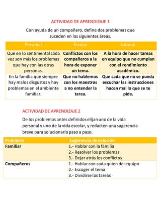 Este documento presenta una serie de actividades de aprendizaje relacionadas con la resolución de problemas a través de algoritmos y diagramas de flujo. La primera actividad pide definir problemas personales y escolares. La segunda sugiere soluciones breves a estos problemas mediante pasos. Otras actividades completan tablas de datos de entrada y salida, evalúan algoritmos, redactan algoritmos y diagramas de flujo, y relacionan conceptos clave.