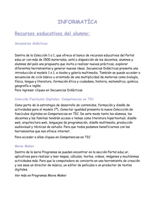 El documento presenta varios recursos educativos digitales disponibles para docentes, alumnos y familias, incluyendo secuencias didácticas de diferentes materias, fascículos sobre competencias TIC, programas como Movie Maker y herramientas de ofimática como Writer, Word, Calc y Excel. También presenta un escritorio para familias con información sobre el uso responsable de la tecnología y uno para docentes con materiales pedagógicos y cursos de capacitación.