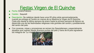 Este documento describe varias fiestas tradicionales del Ecuador, incluyendo la Fiesta de la Virgen de El Quinche en enero/febrero en Saquisilí, el Carnaval de Guaranda en marzo, y el Festival Folclórico de la Chonta en abril en Archidona. También menciona fiestas como el Feriado Mundial del Banano en septiembre en Machala, la Diablada de Pillaro en enero en Píllaro, y las Fiestas de la Cultura Shuar en mayo en Pablo VI.
