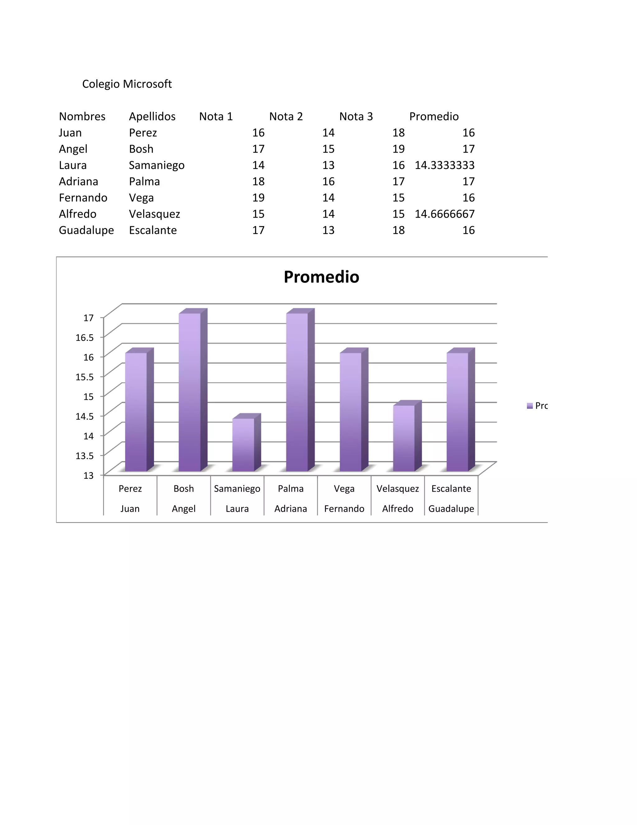El documento presenta las notas de 7 estudiantes de un colegio. Incluye sus nombres, las 3 notas de cada uno y el promedio. También muestra un gráfico con los promedios de cada estudiante.