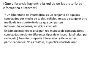 La primera sección compara una red de laboratorio de informática con Internet, explicando que una red de laboratorio conecta equipos dentro de un mismo lugar para compartir recursos e información, mientras que Internet es una gran red mundial pública y de bajo costo que permite compartir información globalmente. La segunda sección define un satélite artificial como una nave espacial fabricada en la Tierra u otro lugar del espacio y enviada al espacio exterior para orbitar otros objetos, y explica que los satélites envían información a través de ondas.
