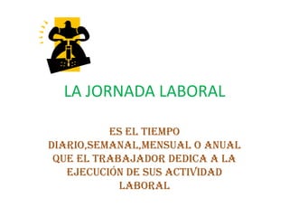 Este documento describe varios aspectos de la jornada laboral y los derechos de los trabajadores en España. Explica que la jornada laboral puede ser diaria, semanal, mensual o anual y que los trabajadores tienen derecho a 12 horas de descanso entre jornadas. También cubre temas como las jornadas nocturnas, horas extras, permisos retribuidos, vacaciones, fiestas laborales, estructura y fondo de garantía salarial.