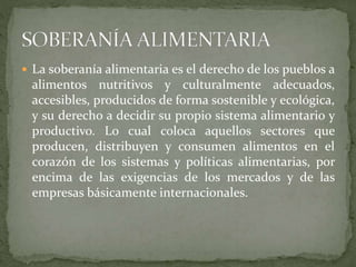 El documento trata sobre la soberanía alimentaria. Define la soberanía alimentaria como el derecho de los pueblos a alimentos nutritivos y culturalmente adecuados producidos de forma sostenible. Describe algunos elementos clave de la soberanía alimentaria como priorizar la producción local, el acceso de campesinos a recursos como tierra y agua, y el derecho de los países a protegerse de importaciones demasiado baratas. Explica que el concepto fue desarrollado por Vía Campesina como alternativa a las políticas neoliberales.