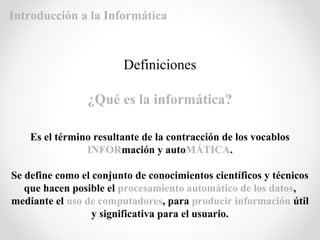 Este documento introduce conceptos básicos de informática como la definición de informática, sistemas informáticos, hardware, software, datos e información. Explica los diferentes tipos de ordenadores clasificados por tamaño como supercomputadoras, mainframes, minicomputadoras, estaciones de trabajo y computadoras personales. También describe cómo los datos son representados y almacenados en sistemas binarios utilizando unidades como bits, bytes, kilobytes y más.
