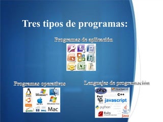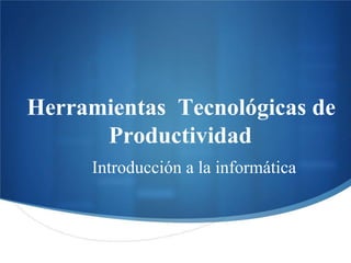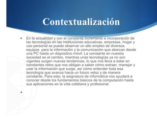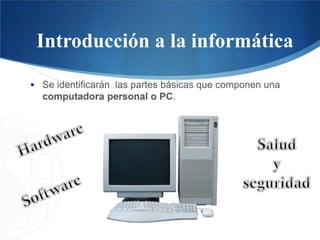 Este documento introduce las computadoras personales o PC. Explica que el hardware son los componentes físicos como la unidad central, monitor y teclado, mientras que el software son los programas que controlan el funcionamiento de la máquina. También cubre medidas de salud y seguridad como mantener el equipo libre de polvo y evitar trabajos prolongados frente a la pantalla.
