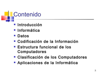 Este documento presenta una introducción a la informática. Explica que la informática involucra la adquisición, representación, procesamiento y transmisión de información utilizando computadoras. Define informática como el conjunto de conocimientos científicos y técnicas que hacen posible el tratamiento automático de la información por medio de ordenadores. Describe las unidades funcionales básicas de un computador, incluyendo la unidad de entrada, memoria, unidad aritmético-lógica, unidad de control y unidad de salida.