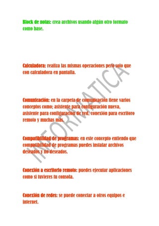 Este documento presenta un glosario de términos relacionados con Windows, incluyendo conceptos como accesibilidad, administración de utilidades, accesorios, arranque, block de notas, calculadora, comunicación, compatibilidad de programas, conexión a escritorio remoto, conexión de redes, entretenimiento, escritorio, grabadora de sonidos, herramientas del sistema, imágenes, iconos, libreta de direcciones, menú, paint y word pad. Explica brevemente el significado y funcionalidad de cada uno de