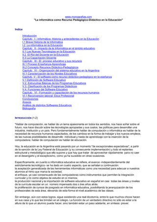 Este documento trata sobre el uso de la informática como recurso pedagógico en la educación. Explica brevemente la historia de la informática y su incorporación en la educación. Detalla los impactos positivos de las nuevas tecnologías en la enseñanza, el rol del docente y la necesidad de capacitación. También analiza el proceso de enseñanza-aprendizaje y los recursos didácticos. Finalmente, describe el software educativo como herramienta y su clasificación, funciones y uso en las distintas áreas del currículo
