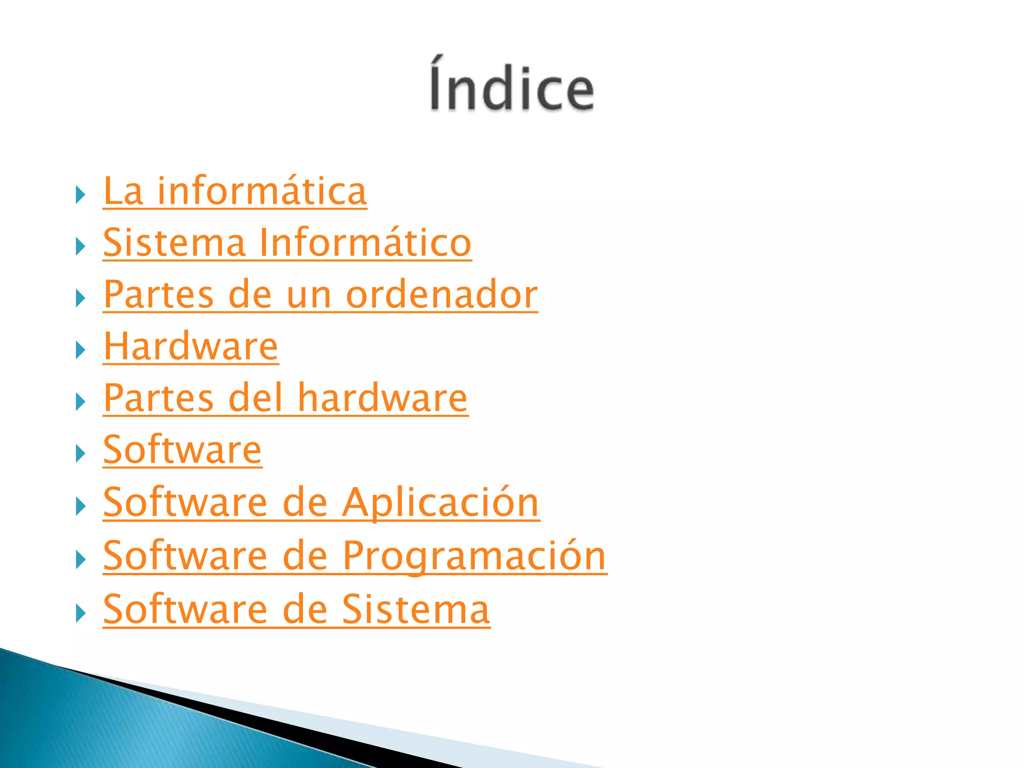 Este documento define conceptos clave de la informática como la informática, sistema informático, hardware y software. Explica que la informática estudia métodos para almacenar y procesar datos digitalmente. Un sistema informático consta de hardware, software y recursos humanos. El hardware incluye componentes físicos como la CPU, memoria y periféricos. El software incluye aplicaciones de usuario, herramientas de programación y sistemas operativos.