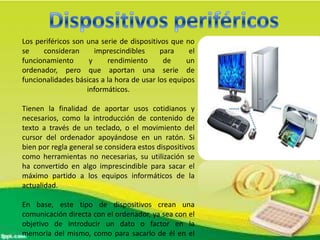 Este documento describe diferentes dispositivos periféricos utilizados en computadoras. Explica que los periféricos incluyen dispositivos de entrada como teclados y ratones, dispositivos de salida como monitores e impresoras, y dispositivos de almacenamiento y comunicación. El documento analiza cada tipo de periférico y proporciona ejemplos como escáneres, cámaras digitales y tarjetas de red.