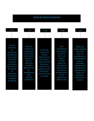 Este documento describe los diferentes tipos de redes de datos, incluyendo PAN, LAN, CAN, MAN y WAN. PAN se refiere a redes inalámbricas de corto alcance, LAN son redes locales dentro de un edificio o área de 200 metros, CAN cubren áreas más grandes como un campus universitario, MAN son redes metropolitanas que cubren barrios o pequeñas ciudades, y WAN son redes amplias globales diseñadas para interconectar otras redes.