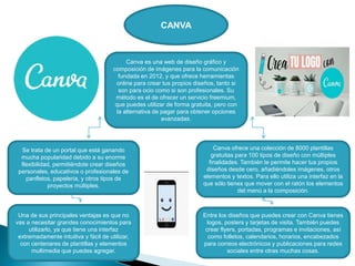 Este documento compara tres programas populares para crear presentaciones: Canva, PowerPoint y Prezi. Canva es una plataforma en línea gratuita e intuitiva que permite crear diseños profesionales y educativos utilizando plantillas y elementos multimedia. PowerPoint es el software de presentación más popular que ofrece opciones para combinar imágenes, texto, música y animaciones. Prezi es una aplicación que permite crear presentaciones dinámicas en un lienzo abierto utilizando efectos visuales, zooms y movimientos.