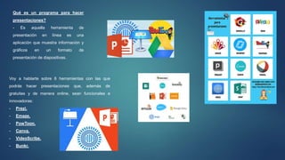 El documento presenta una introducción a los programas para crear presentaciones, destacando seis herramientas en línea como Prezi, Emaze, Powtoon, Canva, Videoscribe y Bunkr. Se resalta la popularidad de Canva gracias a su interfaz intuitiva y opciones freemium, así como la versatilidad de Microsoft PowerPoint. Además, se menciona a Prezi como una opción innovadora que permite una narrativa no lineal en un único lienzo, facilitando la exploración de ideas.