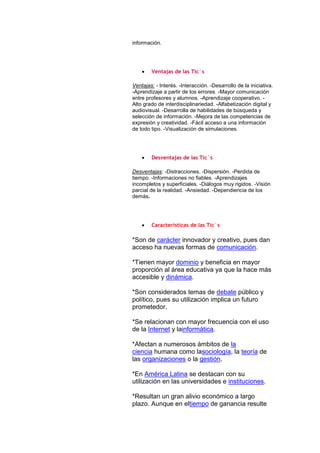 Las TICs pueden definirse como tecnologías tradicionales de comunicación como la radio y televisión, y tecnologías modernas de información como la informática, telemática e interfaces. Permiten la gestión y transformación de información a través de ordenadores y programas. Los primeros pasos hacia una sociedad de la información incluyen invenciones como el telégrafo, teléfono, radio y televisión, mientras que Internet, telecomunicaciones móviles y GPS son consideradas nuevas TICs.