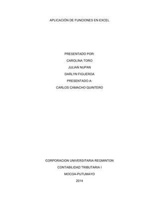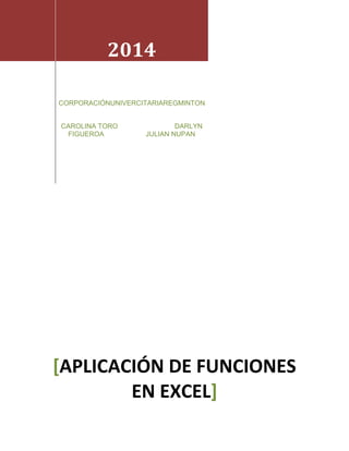 Este documento presenta un trabajo sobre la aplicación de funciones en Excel. Contiene una introducción sobre la importancia de aprender a utilizar Excel para facilitar el desarrollo de problemas y cuentas. Luego presenta 7 ejercicios con diferentes funciones como SUM, IF, LÓGICAS (AND, OR) aplicadas a tablas de datos. Finalmente concluye que Excel es una herramienta útil para la contabilidad que facilita realizar cálculos.