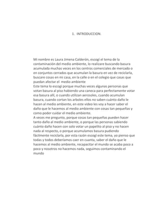 Laura Jimena Calderón ha elegido el tema de la contaminación ambiental. En su documento, explica que investigará la basura acumulada en centros comerciales y otros lugares en vez de ser reciclada, y también buscará ejemplos en su casa, calle y escuela. Ella eligió este tema porque la gente a menudo tira basura en el suelo cuando hay contenedores disponibles, usan aerosoles sin cuidado, y acumulan basura en lugar de reciclar. A través de su video, quiere crear conciencia sobre el daño que