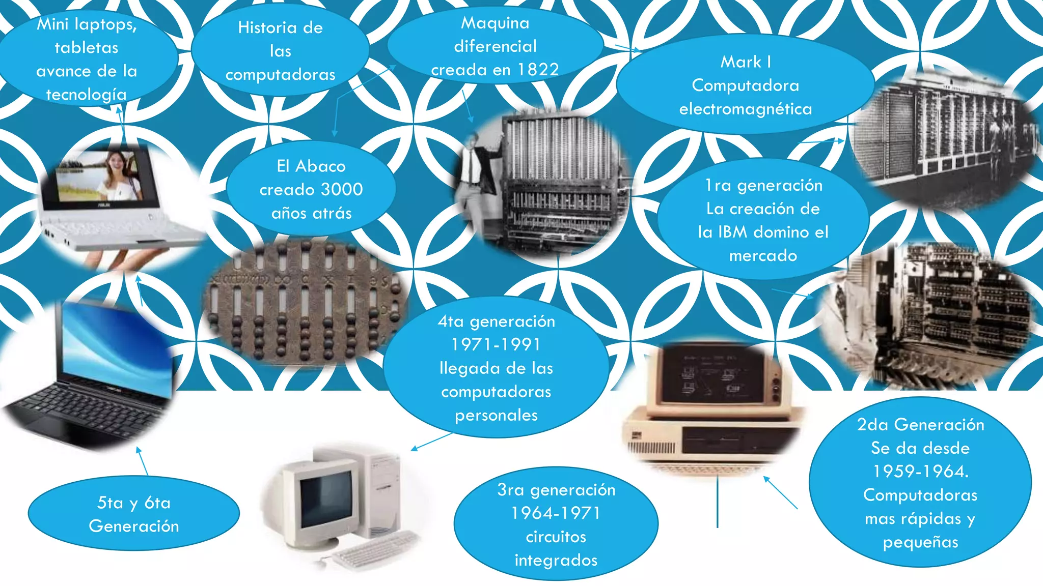El documento resume brevemente la historia de las computadoras a través de las generaciones, comenzando con el Abaco creado hace 3000 años, la máquina diferencial en 1822, y la computadora electromagnética de la primera generación. Luego describe las computadoras más rápidas y pequeñas de la segunda generación desde 1959-1964, el uso de circuitos integrados en la tercera generación de 1964-1971, y la llegada de las computadoras personales en la cuarta generación de 1971-1991. Finalmente, menciona las mini laptops, tabletas, y