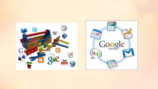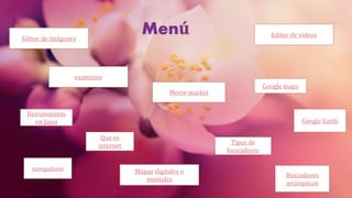 El documento proporciona información sobre diversas herramientas y aplicaciones en línea. Explica brevemente qué es Internet y su origen, así como su principal servicio, la World Wide Web. También define tipos de navegadores, motores de búsqueda, Google Maps, Google Earth, editores de imágenes y videos, y herramientas para crear material educativo. Finalmente, describe diferentes tipos de buscadores y sus características.