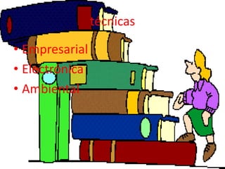 El documento describe tres técnicas educativas - Empresarial, Electrónica y Ambiental. La técnica Empresarial enseña cómo crear y administrar empresas de manera eficiente. La técnica Electrónica capacita a los estudiantes en el mantenimiento y uso de la tecnología, la cual es fundamental en el siglo XXI. La técnica Ambiental crea conciencia sobre el impacto ambiental de la sociedad moderna y enseña cómo mejorar el medio ambiente. Cualquiera de estas tres técnicas proporciona habilidades