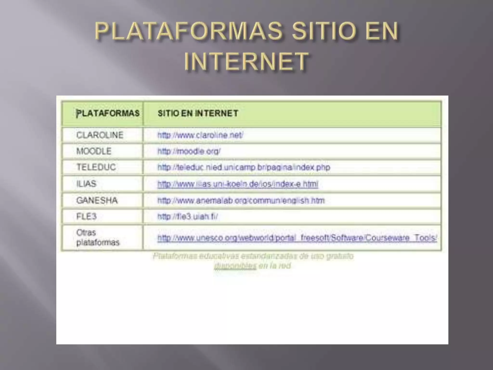 El documento describe una plataforma educativa virtual como un entorno que permite a los profesores crear cursos en línea con materiales educativos, foros, tareas y otras herramientas. Explica los tipos de plataformas, incluidos los gestores de recursos, aulas virtuales y sistemas de gestión del aprendizaje. También analiza plataformas específicas como Claroline, Moodle y otras.