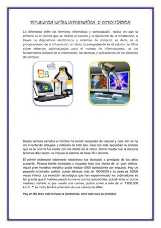 Este documento proporciona información sobre la historia de la computación e informática. Define informática como el procesamiento automático de información mediante dispositivos electrónicos y sistemas computacionales. Explica las primeras ideas de cálculo que tuvo el hombre y los primeros ordenadores electrónicos que se desarrollaron en la década de 1940. Además, describe las cinco generaciones de ordenadores desde la primera generación basada en tubos de vacío hasta la actual quinta generación de ordenadores personales.