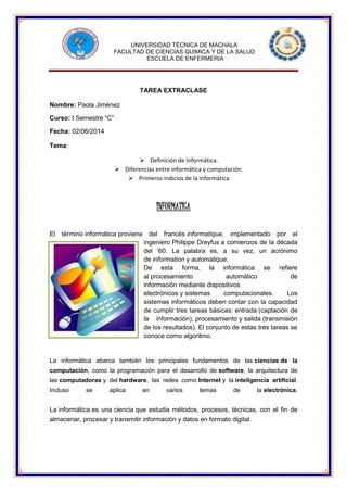 El documento proporciona información sobre la definición e historia de la informática y la computación. Define la informática como la ciencia del procesamiento automático de información mediante dispositivos electrónicos, mientras que la computación se refiere al estudio de sistemas automatizados para el manejo de información. Traza los orígenes de la computación desde los primeros cálculos del hombre hasta el desarrollo de los primeros ordenadores electrónicos en las décadas de 1940 y 1950. Finalmente, describe las cinco generaciones de ordenadores desde la era de los tubos