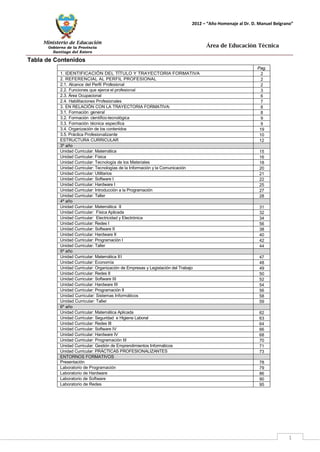 Este documento presenta el plan de estudios y contenidos curriculares para el título de Técnico en Informática Profesional y Personal en la modalidad de Educación Técnico Profesional de 2o ciclo en la provincia de Santiago del Estero, Argentina. Describe el perfil profesional, funciones, áreas de desempeño, y habilitaciones. Además, detalla la estructura curricular dividida en unidades curriculares de formación general, científico-tecnológica y técnica específica a lo largo de 6 años