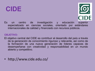 Este documento presenta resúmenes de varias instituciones y plataformas educativas en Colombia. El CIDE es un centro de investigación especializado en ciencias sociales con el objetivo de contribuir al desarrollo del país a través de la generación de conocimiento y formación de líderes. Maestros del Web discute el uso de plataformas virtuales para el aprendizaje en el país. ZETI es una plataforma tecnológica que permite a instituciones educativas desarrollar procesos administrativos, académicos y