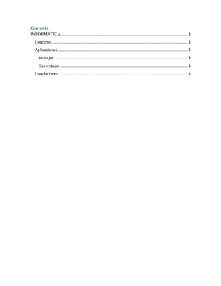 Este documento define la informática como la ciencia que estudia el tratamiento automático y racional de la información a través de máquinas. Explica que las aplicaciones informáticas son programas diseñados para permitir a los usuarios realizar tareas. Enumera ventajas como la conectividad a través de redes sociales y entretenimiento con juegos, pero también desventajas como adicciones, pensamiento superficial y basura electrónica. Concluye que la informática es fundamental para el trabajo y estudio pero debe usarse para el bien.