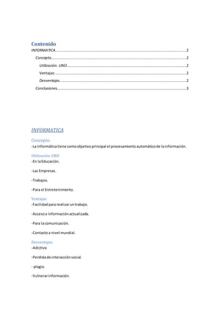 Este documento presenta un resumen sobre el tema de la informática. Define la informática como el procesamiento automático de la información. Explora algunos usos de la informática como la educación, empresas, trabajos y entretenimiento. También discute ventajas como la facilidad para trabajar y acceder información actualizada, y desventajas como volverse adictivo, perder interacción social y vulnerar información. Concluye que si bien la informática tiene usos beneficiosos, también puede tener usos perniciosos y es un pilar fundamental en la vida actual.