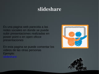 Slideshare, Facebook y YouTube son sitios web de redes sociales donde los usuarios pueden publicar presentaciones, fotos, videos y comentar los contenidos de otros. Hotpotatoes y Smartboard son programas educativos que ayudan a crear actividades interactivas y grabar presentaciones con audio. Myspace, Hi5, Sonico y Bebo también son redes sociales donde los usuarios interactúan a través de perfiles, mensajes y contenidos compartidos.