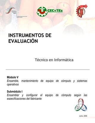 Este documento presenta instrumentos de evaluación para la carrera de Técnico en Informática en México. Incluye guías de observación y listas de cotejo para evaluar la competencia de los estudiantes en ensamblar y configurar equipos de cómputo siguiendo especificaciones. Los instrumentos cubren actividades como seleccionar hardware, instalar sistemas operativos y software, e instalar utilerías siguiendo procedimientos establecidos.