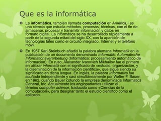 El documento habla sobre la informática. Define la informática como la ciencia que estudia métodos para almacenar, procesar y transmitir información digitalmente. Explica que la informática se ha desarrollado rápidamente desde la segunda mitad del siglo XX con tecnologías como el circuito integrado e Internet. También describe algunas aplicaciones e importancia de la informática en áreas como la agricultura, servicios, entretenimiento y ética.