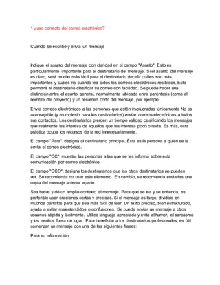 Este documento presenta información sobre el uso adecuado de las tecnologías de la información y la comunicación (TIC), en particular el correo electrónico y las redes sociales. Explica cómo escribir y enviar correos electrónicos de manera efectiva y cómo utilizar las redes sociales de forma segura y responsable. También proporciona consejos sobre cómo administrar el correo electrónico de manera organizada y evitar el correo no deseado.