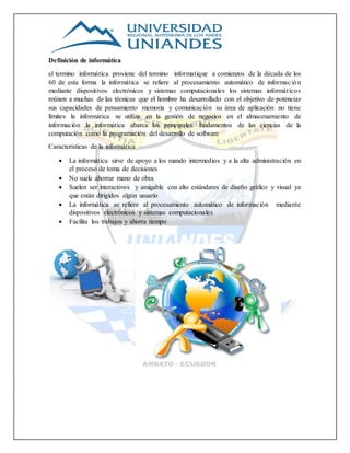 La información se define como un conjunto organizado de datos que constituye un mensaje capaz de cambiar el estado de conocimientos de quien lo recibe. La informática se refiere al procesamiento automático de información mediante dispositivos electrónicos y sistemas computacionales, y se utiliza en gestión de negocios, almacenamiento de información y otras áreas sin límites. Algunas características de la información y la informática son la exactitud, objetividad y velocidad de la información, y que la informática sirve para apoyar la toma de decision