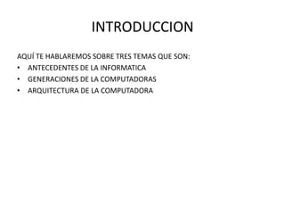 Este documento resume tres temas clave sobre la informática: 1) Los antecedentes históricos de la computadora, incluyendo inventos tempranos como el ábaco y las máquinas mecánicas de cálculo de Pascal y Babbage; 2) Las cinco generaciones de computadoras definidas por los cambios tecnológicos como el uso de válvulas, transistores y microprocesadores; 3) La arquitectura básica de una computadora moderna.