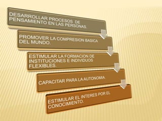 Este documento describe los principales retos que debe afrontar la educación superior en la sociedad actual para promover el desarrollo de una mejor sociedad. Entre estos retos se encuentran: 1) desarrollar el pensamiento crítico en las personas; 2) promover la comprensión básica del mundo; y 3) estimular la formación de instituciones e individuos flexibles.