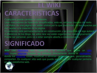 Un wiki es un sitio web cuyas páginas pueden ser editadas directamente por los usuarios, permitiendo que creen, modifiquen o eliminen contenido de manera colaborativa. Los wikis usan editores visuales simplificados y los títulos de las páginas están unidos sin espacios para agilizar la creación de contenido. A diferencia de los blogs, las wikis rara vez están organizadas cronológicamente.