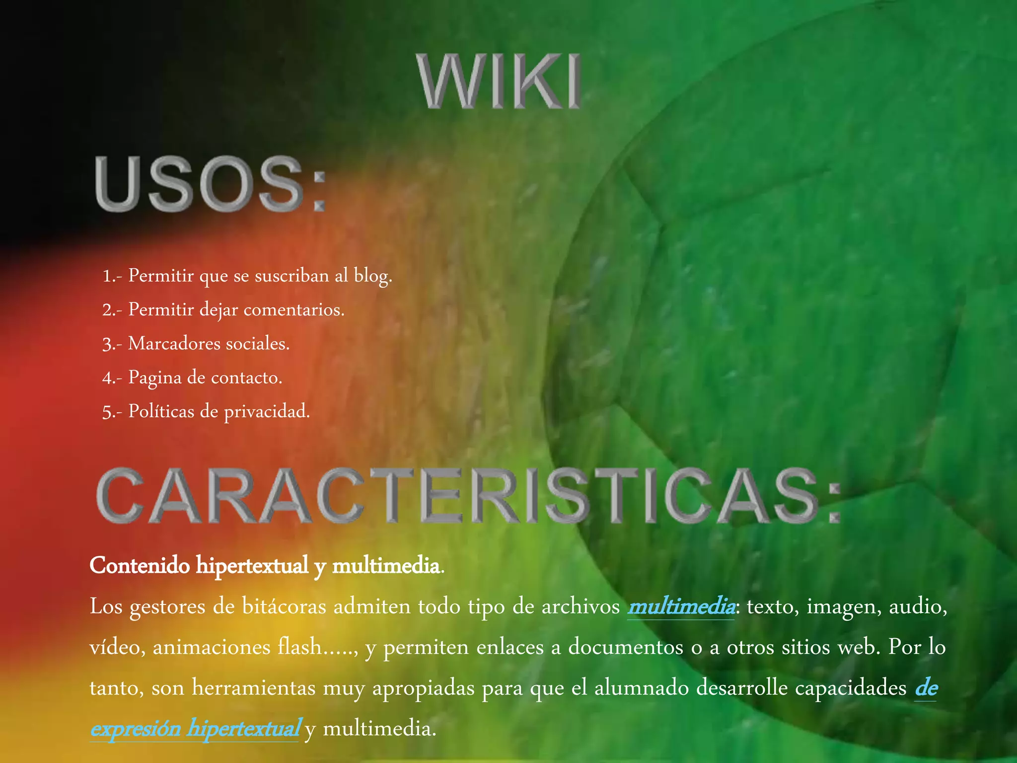 El documento habla sobre las características y funcionalidades de los blogs y herramientas de gestión de contenidos como SlideShare. Permite subir archivos multimedia como texto, imágenes, audio y video para desarrollar habilidades hipertextuales y multimedia. También permite compartir presentaciones en la nube de manera gratuita, son fáciles de configurar y publicar desde cualquier lugar.