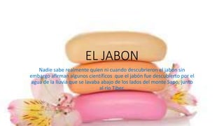 El jabón fue descubierto probablemente por accidente por esclavos en el Monte Sapo junto al río Tiber en Italia, cuando la grasa animal mezclada con ceniza de madera limpió sus manos. Los egipcios fueron los primeros en bañarse con jabón y también lo usaban como medicamento. Aunque su uso disminuyó durante la Edad Media, volvió a usarse en siglos posteriores y en el siglo XIX se empezaron a emplear aceites de coco y palma en su fabricación.