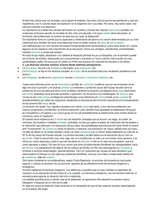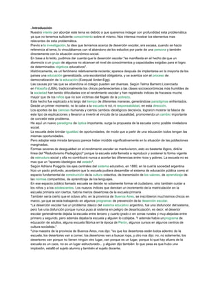 La deserción escolar es un problema histórico en Argentina que se debe a múltiples factores. Las causas incluyen factores socioeconómicos como la pobreza, factores familiares como la falta de afecto o problemas en el hogar, y factores escolares como una baja calidad de educación o falta de adaptación de la escuela a las necesidades de los estudiantes. Abordar la deserción escolar requiere un enfoque multidisciplinario que considere todos estos factores.