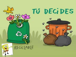 Este documento habla sobre el reciclaje y cómo contribuye a proteger el medio ambiente. Explica las tres erres de reducir, reutilizar y reciclar. Describe los diferentes tipos de contenedores para clasificar la basura como azul para papel, verde para vidrio, amarillo para plástico y gris para orgánica. Resalta los beneficios de reciclar como ahorrar recursos, energía y reducir la contaminación.